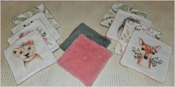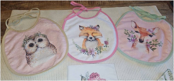 Bavoirs en éponge Doux Imprimer animaux pour la face devant et Dos. s'attache par le contour du biais. contenu du trousseau: 3 bavoirs, 10 Petit gants doux, un protège carnet de santé, une gigoteuse et un Doudou. Pour Avoir le Trousseau Complet m'en faire la demande par Mail ou passer une commande sur mon site.