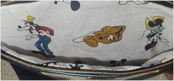 Réaliser en simili cuir et coton accompagner de son Porte clé tete de mickey.incruster de toute petite pallete assorti a l'interieur de la broderie centrale. Couleur Bleu.